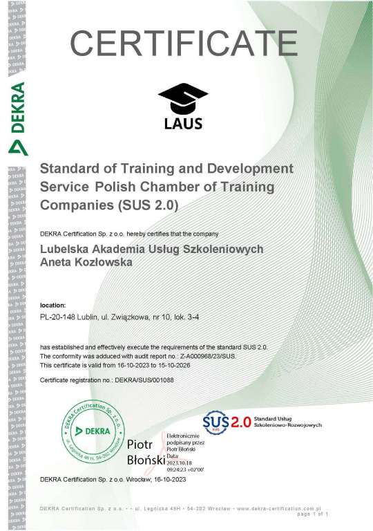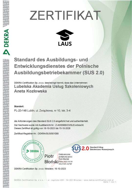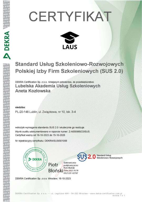 LAUS Aneta Kozłowska współpracuje z Urzędami pracy, fundacjami, stowarzyszeniami, szkołami i innymi instytucjami państwowymi. Firma od 2018 roku posiada wpis do Rejestru Instytucji Szkoleniowych pod nr 2.06/00121/2018.
