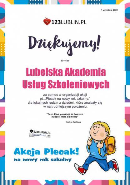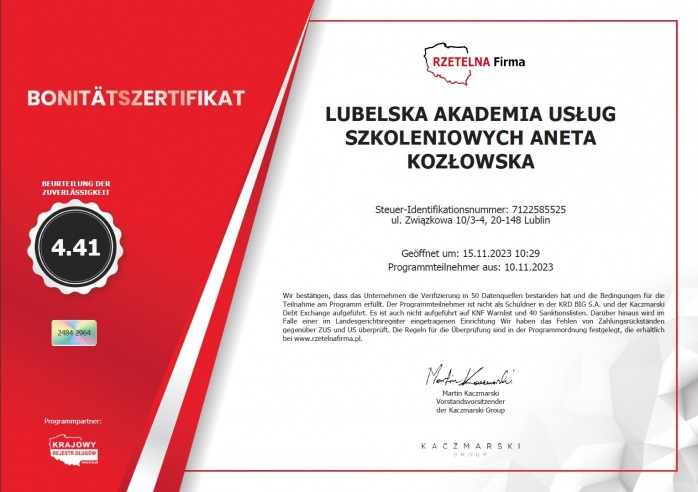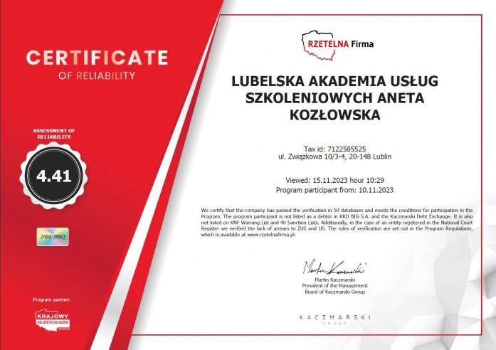 Lubelska Akademia Usług Szkoleniowych Aneta Kozłowska to firma szkoleniowa zlokalizowana na terenie miasta Lublin. Firma prowadzi kursy i szkolenia zawodowe, których deficyt odczuwany jest na rynku pracy.